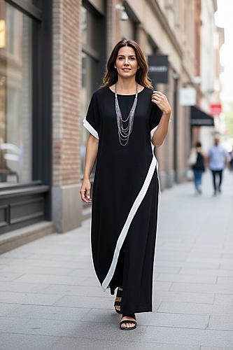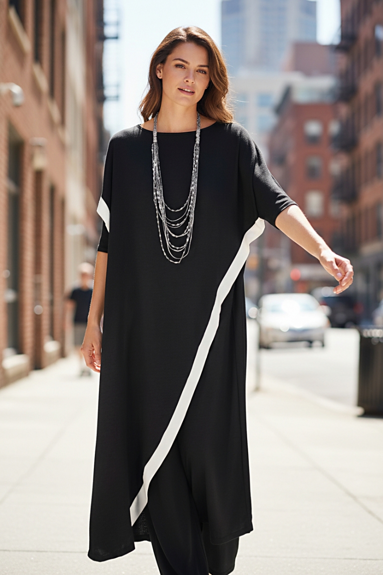Αναδείξτε την κομψότητα και τη θηλυκότητά σας με αυτό το μοναδικό σετ που συνδυάζει άνεση και διαχρονικό στυλ. Το αέρινο φόρεμα σε minimal γραμμή με μοντέρνες μαύρες λεπτομέρειες δημιουργεί μια κομψή αντίθεση, ενώ η άνετη παντελόνα με λάστιχο στη μέση χαρίζει ελευθερία κινήσεων και chic εμφάνιση από το πρωί έως το βράδυ.