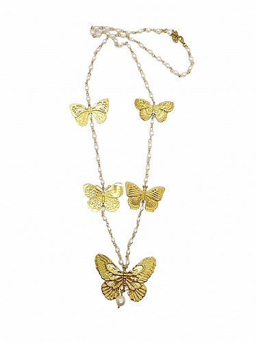 Κολιέ με πέρλες στην αλυσίδα και χρυσές κρεμαστές πεταλούδες σε διάφορα μεγέθη.