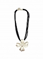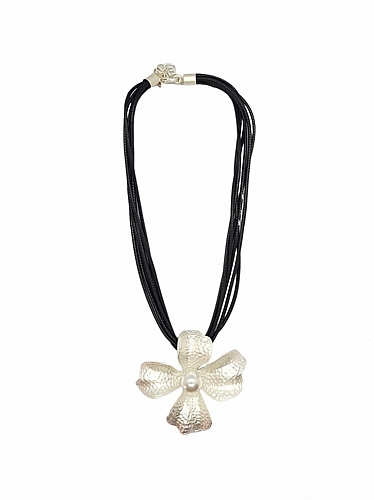 Κολιέ με μαύρα κορδόνια από δερματίνη και ασημί μεταλλικό λουλούδι.
