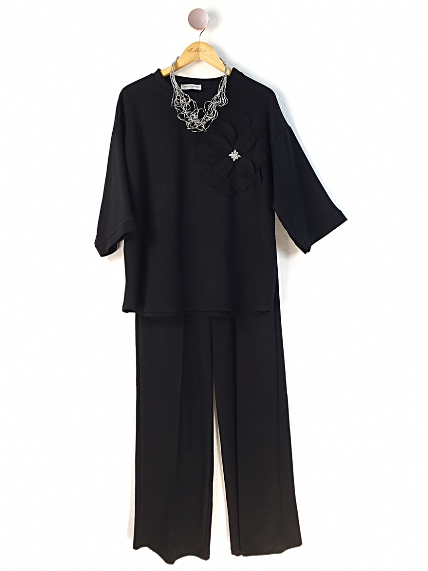 Μπλούζα με λουλούδι στρας στο στήθος και στρογγυλή λαιμόκοψη.