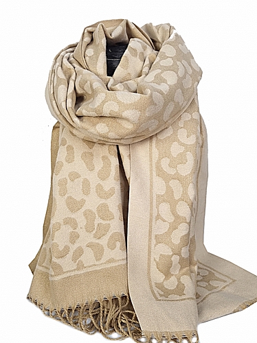 Εντυπωσιακή απαλή και ζεστή πασμίνα σε μπεζ χρώμα και σχέδια με χρυσές λάμψεις.