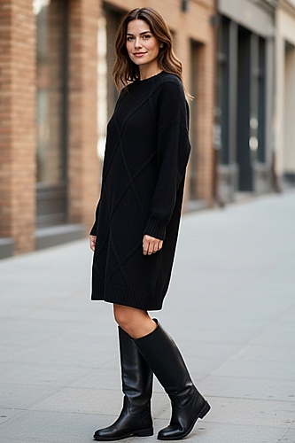 Απαλή πλεκτό φόρεμα σε φαρδιά γραμμή με διακριτικό ανάγλυφο σχέδιο.