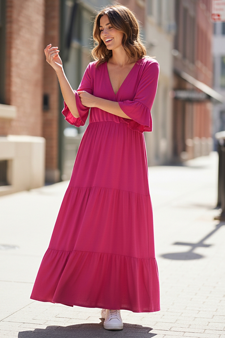 Μακρύ φόρεμα σε εντυπωσιακό φούξια χρώμα με λαιμόκοψη σε σχήμα V που αναδεικνύει το ντεκολτέ και χαρίζει θηλυκότητα.