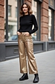 Μεταλλικό χρυσό παντελόνι, μίας όψης, σε κομψή γραμμή. Είναι ευκολοφόρετο και συνδυάζει την άνεση με το στυλ της υψηλής μόδας.