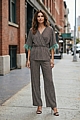 Το παντελόνι με λάστιχο στη μέση και σε ίσια γραμμή ολοκληρώνει το σύνολο, προσφέροντας άνετη εφαρμογή και κομψή σιλουέτα.