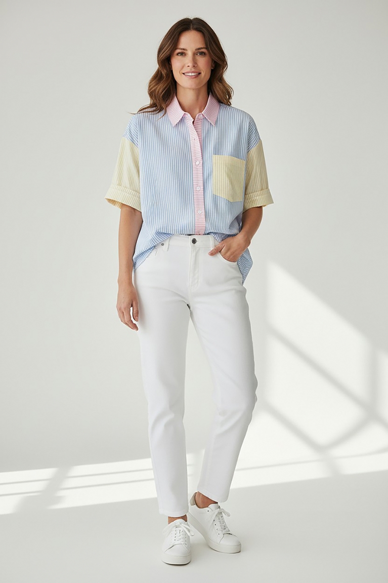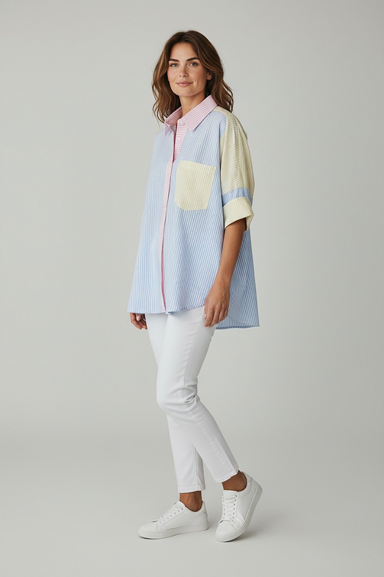 Μοντέρνο και ξεχωριστό, αυτό το ριγέ πουκάμισο συνδυάζει αρμονικά διαφορετικές αποχρώσεις για ένα σύγχρονο αποτέλεσμα. Οι color block λεπτομέρειες σε παστέλ τόνους και η αντίθεση με τον γιακά χαρίζουν ιδιαίτερο χαρακτήρα.
