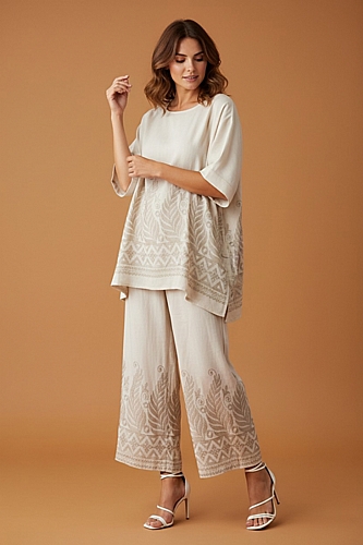 Ξεχώρισε με αυτό το ιδιαίτερο σετ δύο τεμαχίων που συνδυάζει άνεση και μοναδικό design. To loose τοπ με κοντό μανίκι διαθέτει εντυπωσιακό χρυσοκέντητο μοτίβο στο τελείωμα, προσθέτοντας χαρακτήρα σε ένα κατά τα άλλα minimal κομμάτι.